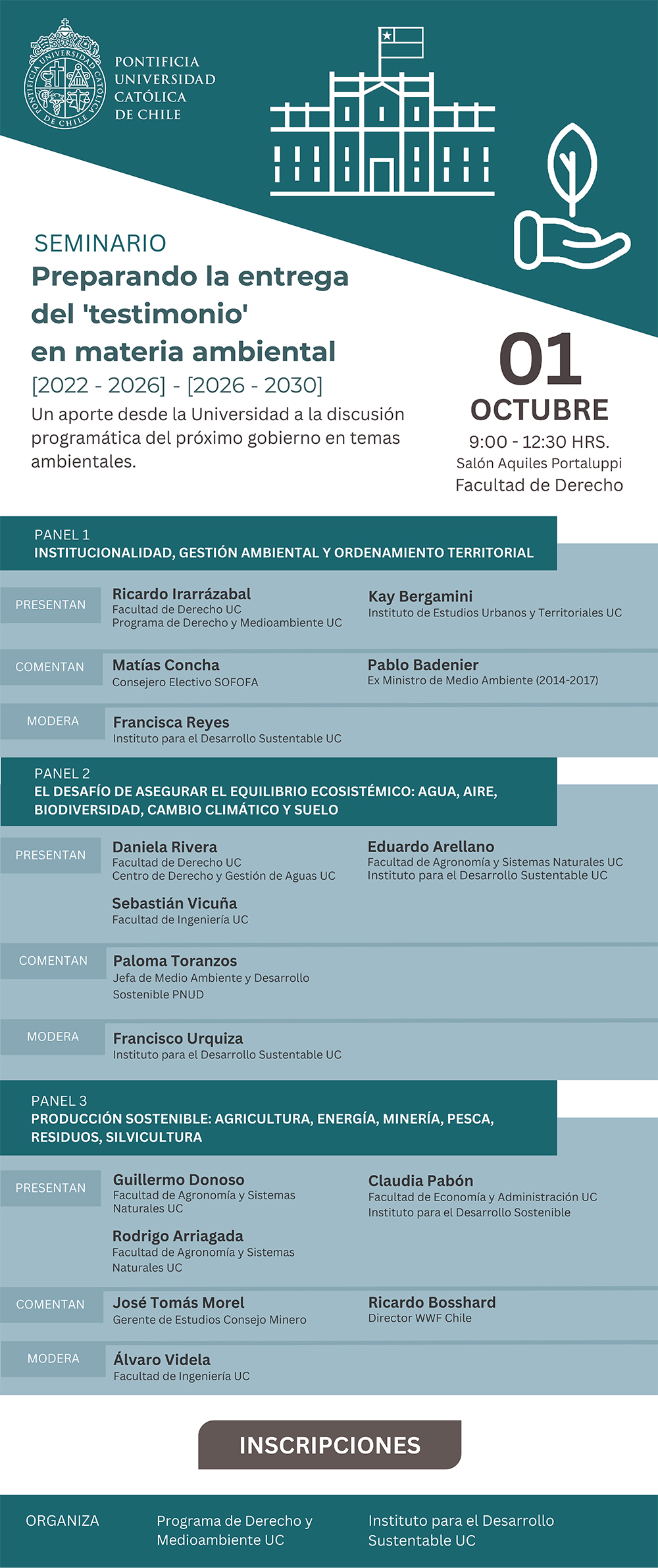 sobre 15 áreas de política pública ambiental, como un aporte a la discusión programática del próximo gobierno en esta materia. En el ámbito de recursos hídricos, nuestro CDGA participó activamente a través de los aportes de los profesores UC Guillermo Donoso (Agronomía y Sistemas Naturales) y Daniela Rivera (Derecho). Este trabajo, que reunió a 17 académicos de 11 Facultades y Unidades Académicas de la UC, busca promover una conversación informada y basada en evidencia sobre los desafíos ambientales actuales y futuros.