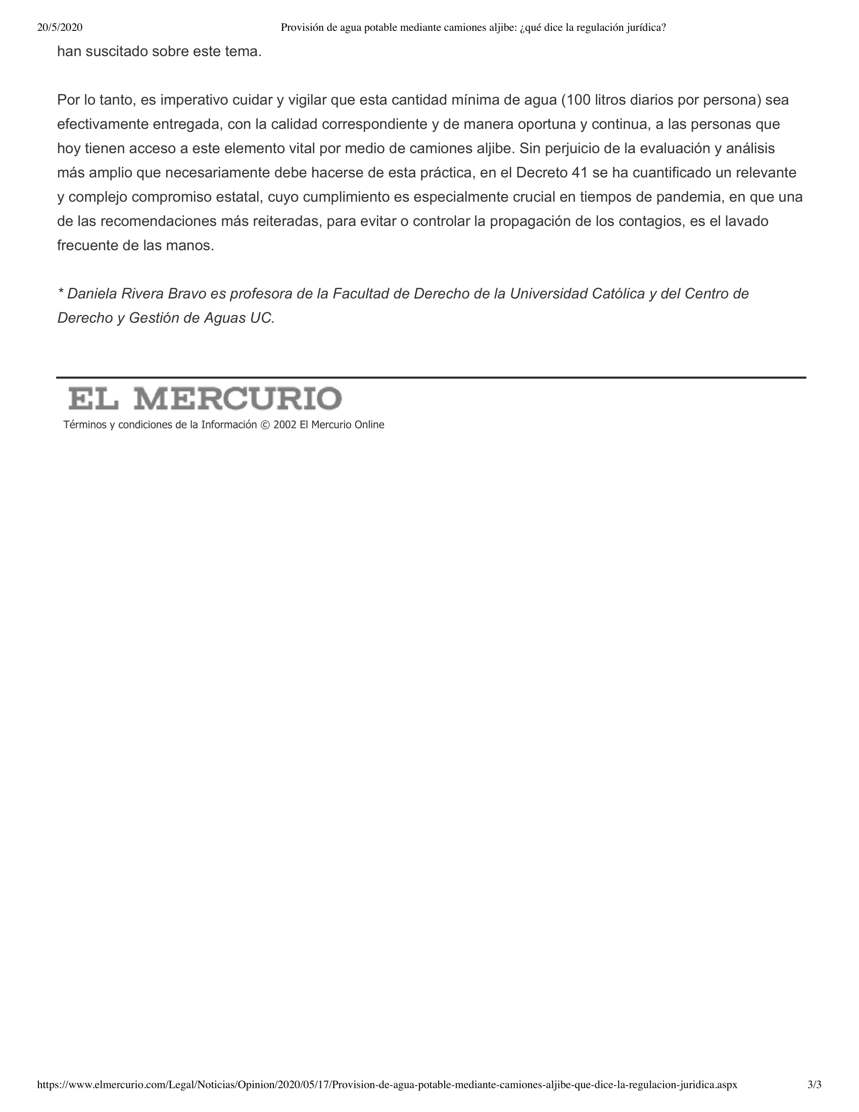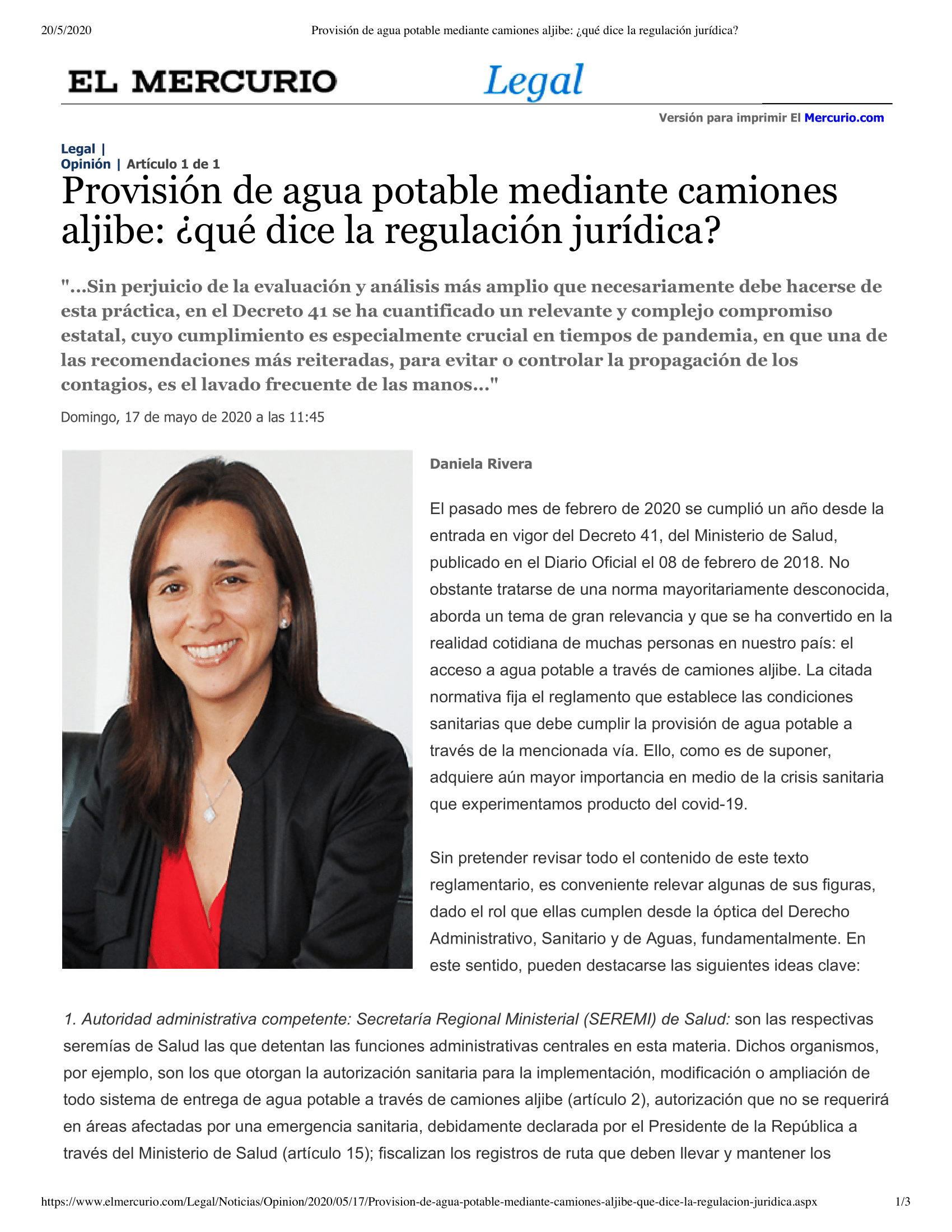 [El Mercurio Legal] Daniela Rivera: Provisión de agua potable mediante camiones aljibe: ¿Qué dice la regulación jurídica?