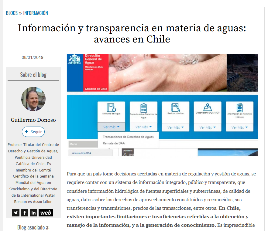 Recientemente, la Dirección General de Aguas (DGA) de Chile, órgano que ejerce la administración centralizada de las aguas en Chile, ha incorporado en su página web una sección denominada “Mercado del Agua”, que incorpora, a su vez, dos subsecciones: una sobre transacciones y otra sobre remates de derechos de aprovechamiento. En la primera, hay “Información histórica recibida de los Conservadores de Bienes Raíces en relación a los derechos de aguas”. Al ingresar, se despliega un listado de planillas Excel, en que figuran, distribuidas por regiones, un importante número de transferencias, transmisiones y otras transacciones o modificaciones de titularidad de derechos de aprovechamiento de aguas. Por su parte, en lo referente a los remates, se incluyen datos sobre remates realizados y por efectuar en aquellos casos en que, presentadas dos o más solicitudes de derechos de aprovechamiento en la misma fuente natural, no existe disponibilidad de aguas para satisfacer todos esos requerimientos, ante lo cual la legislación ha introducido el mecanismo de mercado (remate) para asignar originariamente los respectivos derechos de aprovechamiento.