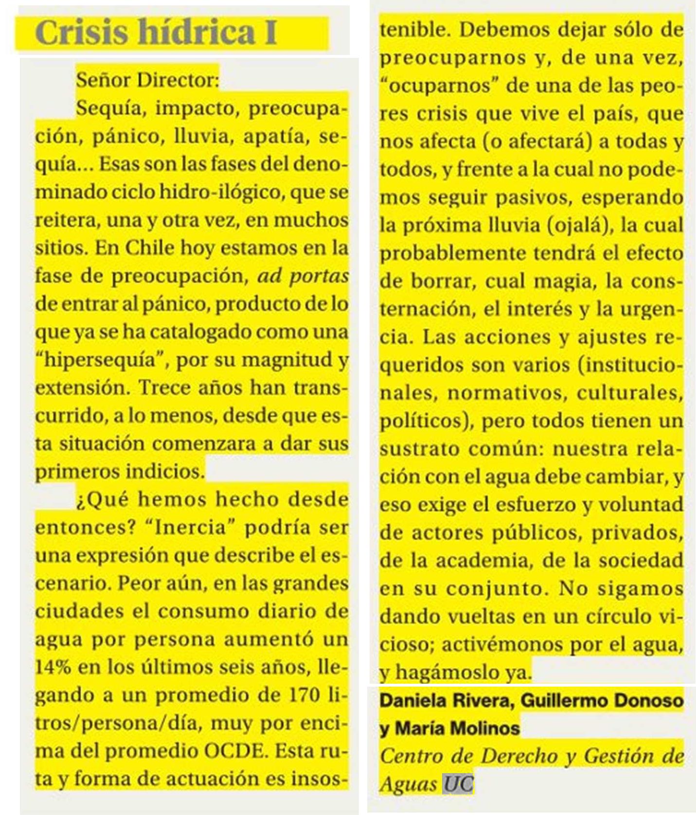 [La Segunda] Carta al Director: "Crisis hídrica I" Daniela Rivera, Guillermo Donoso y María Molinos