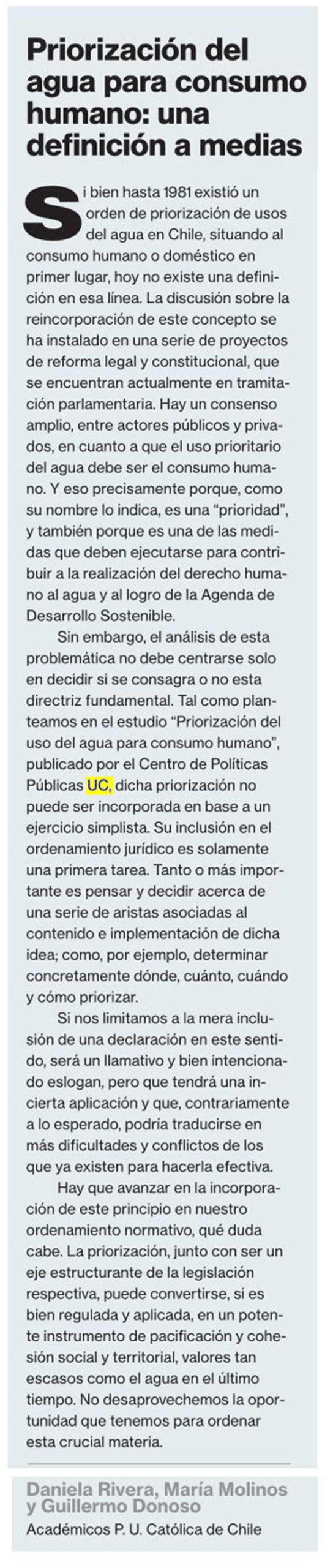 [La Segunda] Daniela Rivera, María Molinos y Guillermo Donoso: Priorización del agua para consumo humano: una definición a medias
