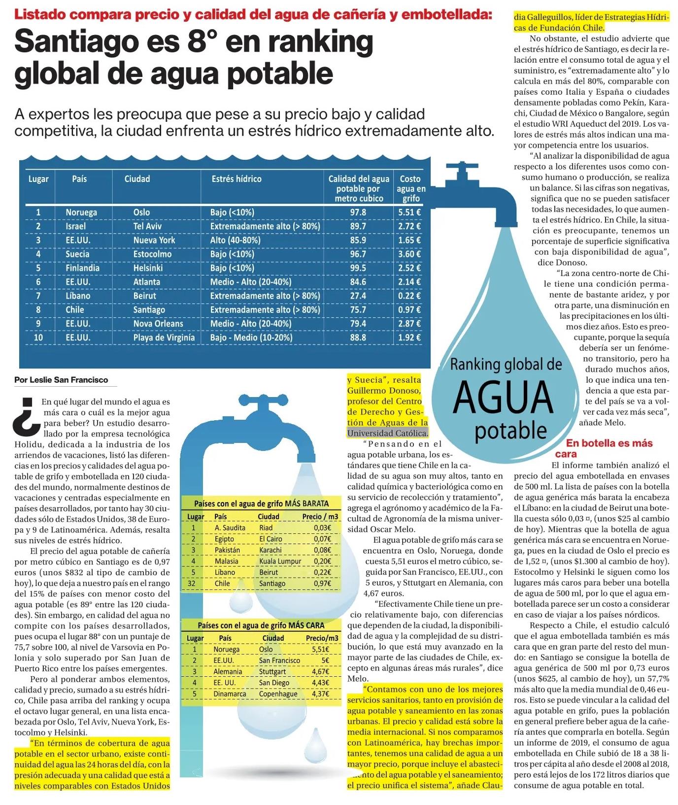 [La Segunda] Participación reportaje Guillermo Donoso: Santiago en 8° en ranking global de agua potable